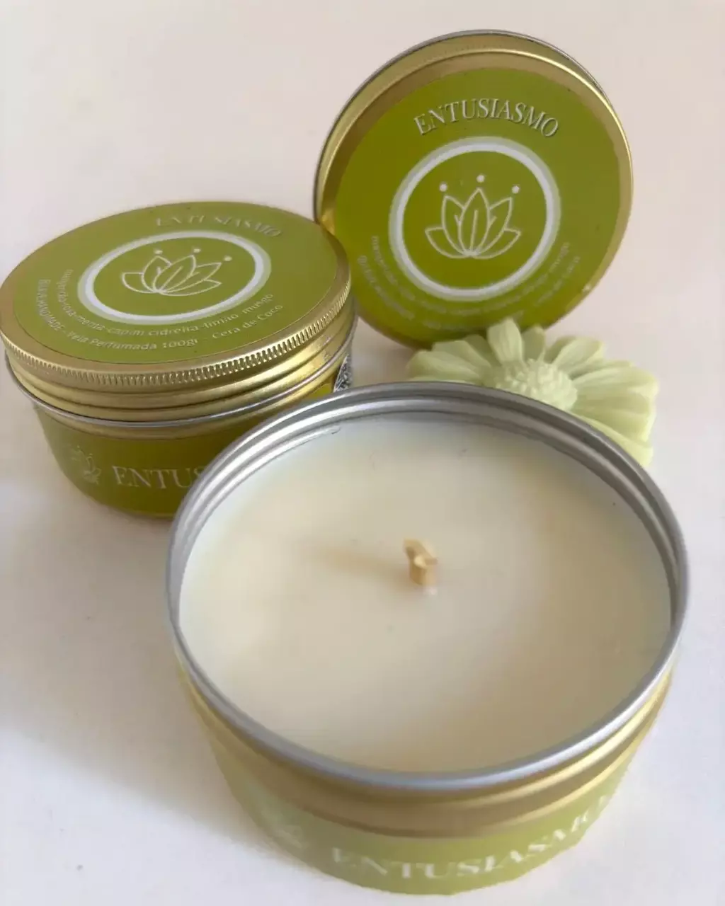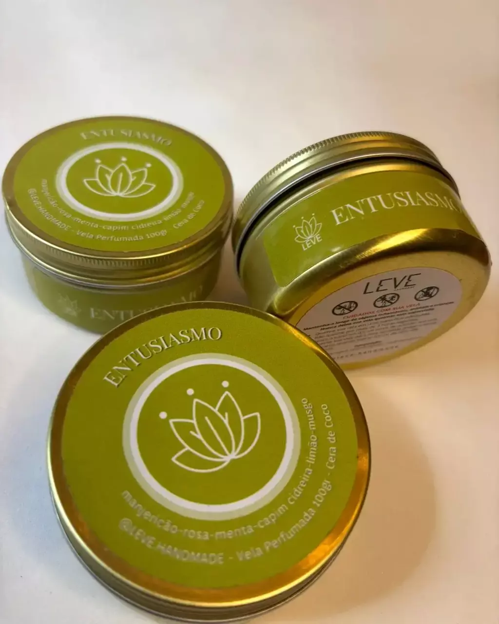 Embalagem: alumínio dourado com tampa de rosca (podendo ser totalmente reaproveitada após o término da vela
